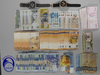 Σε έρευνα που διενεργήθηκε στην κατοικία του συλληφθέντα, βρέθηκαν και κατασχέθηκαν χρηματικά ποσά σε χαρτονομίσματα προερχόμενα από διάφορες χώρες, μεταξύ των οποίων ευρώ, δολάρια ΗΠΑ, δολάρια Καναδά, δολάρια Αυστραλίας, ελβετικά φράγκα, λίρες Τουρκίας, Dirhams Ηνωμένων Αραβικών Εμιράτων και Rand Νοτίου Αφρικής.