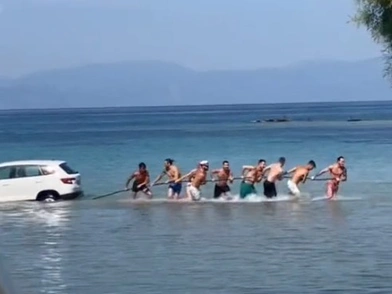 Τότε επιστρατεύθηκαν οι λουόμενοι που ήταν στην παραλία και αφού σχημάτισαν μία... ανθρώπινη αλυσίδα, κατάφεραν να τραβήξουν το αυτοκίνητο από το νερό και να το βγάλουν στην παραλία.