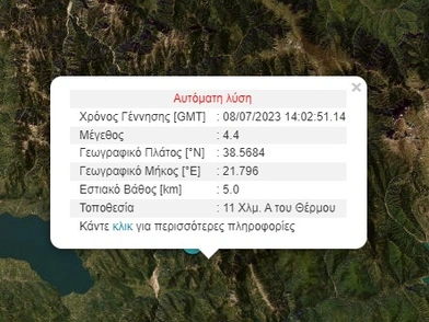 Σύμφωνα με το Γεωδυναμικό Ινστιτούτο, η δόνηση συνέβη σήμερα (08/07) το απόγευμα, λίγο μετά τις 17:00. Ο σεισμός είχε εστιακό βάθος πέντε χιλιόμετρα και το επίκεντρο του εντοπίζεται στα 11 χλμ ανατολικά του Θέρμου.