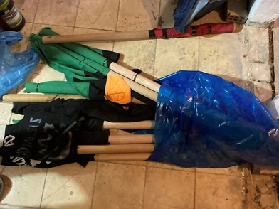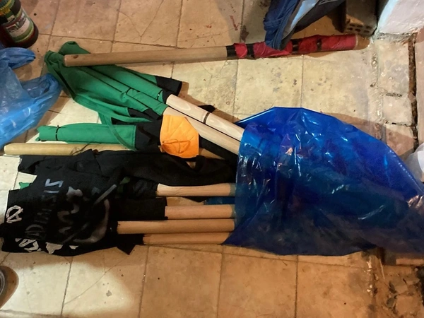 Σύμφωνα με την ΕΛΑΣ, από τις έρευνες που πραγματοποιήθηκαν, βρέθηκαν και κατασχέθηκαν τρία πανό, 28 ξύλινα κοντάρια, 8 αντιασφυξιογόνες μάσκες, 9 κράνη, 11 τεμάχια υφάσματος, μπλούζα και γάντι.