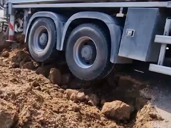 Όπως φαίνεται στο βίντεο που δημοσίευσε το Mega, η άσφαλτος υποχώρησε με συνέπεια το μεγάλο όχημα να πέσει και να κολλήσει στο άνοιγμα.