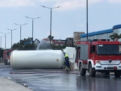 Βυτιοφόρο που μετέφερε υγραέριο τούμπαρε στη λεωφόρο Σχιστού, στην Αττική με αποτέλεσμα να διακοπεί η κυκλοφορία.