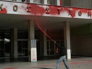Ομάδα αντιεξουσιαστών έριξε κόκκινη μπογιά στον Νέο Σιδηροδρομικό Σταθμό Θεσσαλονίκης ως μια συμβολική παρέμβαση για τον ένα χρόνο από την τραγωδία στα Τέμπη με τους 57 νεκρούς.