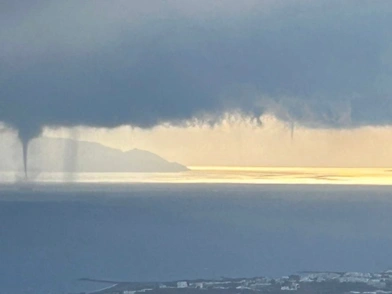 Άλλη μία εντυπωσιακή εικόνα από το φαινόμενο κυκλοφορεί στο διαδίκτυο και δείχνει τους υδροσίφωνες που σχηματίστηκαν πάνω από το νησί.