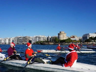 Οι περίπου 40 κωπηλάτες του τμήματος παράκτιας κωπηλασίας ενηλίκων του Ομίλου Φίλων Θαλάσσης, φόρεσαν στολές και κόκκινα σκουφιά και «ρίχτηκαν» στον Θερμαϊκό για να μεταφέρουν το δικό τους ξεχωριστό μήνυμα των Χριστουγέννων.