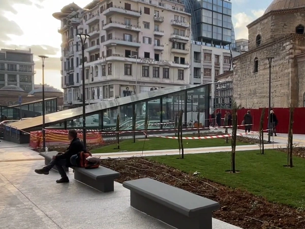 Αφαιρέθηκαν οι λαμαρίνες από τη περίφραξη του εργοταξίου του σταθμού Βενιζέλο, στο μετρό Θεσσαλονίκης και έτσι φάνηκαν οι είσοδοι και ο περιβάλλων χώρος.