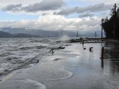 Παράλληλα, οι θυελλώδεις άνεμοι αλλά και οι δυνατές βροχοπτώσεις προκάλεσαν ισχυρές πλημμύρες στην ευρύτερη περιοχή, με αποτέλεσμα να έχουν γεμίσει με νερό οι παραθαλάσσιες περιοχές και να μην υπάρχει δυνατότητα διέλευσης οχημάτων και φυσικά πεζών.