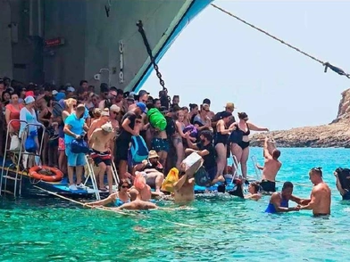 Κωμικοτραγικές εικόνες μας ήρθαν από τον Μπάλο της Κρήτης, στις οποίες φαίνεται φέριμποτ να αποβιβάζει τους τουρίστες καταμεσής τους νερού, καθώς η παραλία δεν διαθέτει προβλήτα πρόσβασης.