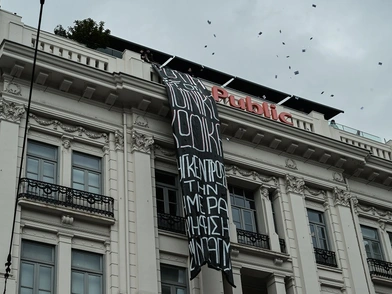 Στην ταράτσα του καταστήματος Public στο Σύνταγμα, κατά τη διάρκεια του πανεκπαιδευτικού συλλαλητηρίου, ανέβηκαν άτομα, τα οποία άνοιξαν τεράστιο πανό και πέταξαν τρικάκια για τον νέο Ποινικό Κώδικα.
