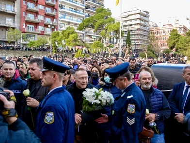 Η οικογένεια του λαϊκού τραγουδιστή που βρισκόταν μαζί του μέχρι τις τελευταίες στιγμές του, έφτασε αγκαλιασμένη στον ιερό ναό, με τη σύζυγο του, την κόρη του και τον αδερφό του να δίνουν δύναμη ο ένας στον άλλο.