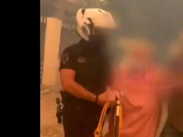 Σε ένα εφιαλτικό σκηνικό με τη φωτιά να κατακαίει τα πάντα και τους καπνούς να έχουν πνίξει την περιοχή, οι αστυνομικοί κρατάνε την ηλικιωμένη και της λένε «σας παρακαλώ πάμε, μπείτε μέσα».