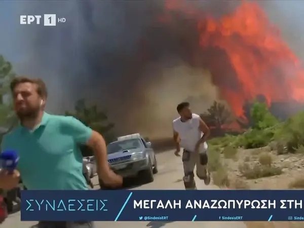 Σοκαριστικό βίντεο κατέγραψε ο τηλεοπτικός φακός της ΕΡΤ, καθώς το συνεργείο που κάλυπτε τις εξελίξεις στο μέτωπο της μεγάλης φωτιάς στη Ρόδο έτρεχε να σωθεί από τις φλόγες που πλησίαζαν απειλητικά.