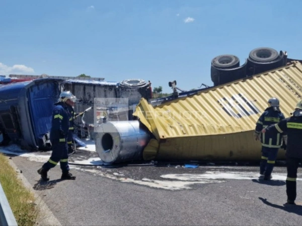 Παραλίγο τραγωδία στην εθνική Βόλου - Λάρισας, στο ύψος του Λατομείου όταν μία νταλίκα ανατράπηκε στο αντίθετο ρεύμα.