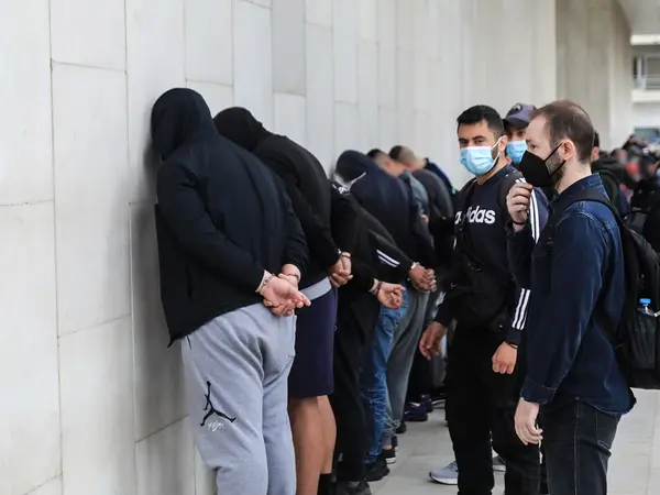 Με τέσσερα πούλμαν, τρία λεπτά μετά τις 09:00, οι συλληφθέντες έφτασαν στην εισαγγελία πρωτοδικών, ενώ τα μέτρα ασφαλείας ήταν δρακόντεια.