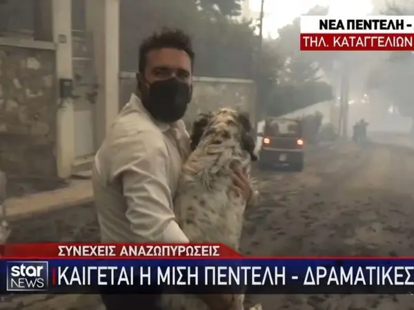 Συγκίνηση προκαλεί η στιγμή που κατά τη διάρκεια ζωντανής σύνδεσης, ο δημοσιογράφος του Star, Άρης Λάμπρου, πήρε στα χέρια του ένα σκυλί, το οποίο είχε χαθεί από τον ιδιοκτήτη του και είχε κοκαλώσει από τον φόβο του προκειμένου να το μεταφέρει σε ασφαλές σημείο τη στιγμή που η φωτιά στη Νέα Πεντέλη είχε αναζωπυρωθεί.