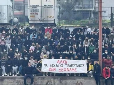 Πριν από 4 χρόνια, οι μαθητές του 2ου Λυκείου Συκεών έστειλαν ένα ηχηρό μήνυμα ελπίδας μετά τη δολοφονία του Άλκη Καμπανού. Στη φωτογραφία δύο παιδιά κρατούν έν πανό που γράφει: «Άλκη, να είσαι ο τελευταίος».
