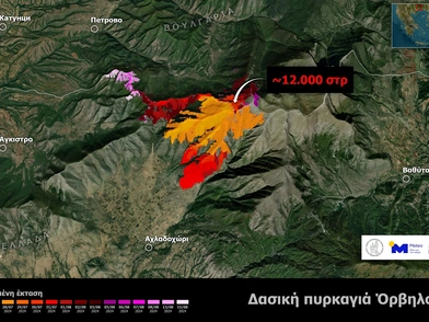 Η καμένη έκταση στην τελευταία ανανέωση από την Υπηρεσία Ταχείας Χαρτογράφησης Copernicus, ανήλθε στα 12.000 στρέμματα (έως την 15.08.2024, 12:15 τοπική ώρα).