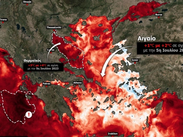Έπειτα από την επεξεργασία δορυφορικών δεδομένων από τη μονάδα meteo.gr του Εθνικού Αστεροσκοπείου Αθηνών, στο πρώτο διάγραμμα παρουσιάζονται οι διαφορές της θερμοκρασίας στην επιφάνεια της θάλασσας, πριν (5 Ιουλίου) και μετά το κύμα καύσωνα (27 Ιουλίου).