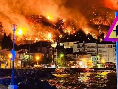 Στην Κορινθία η φωτιά έφτασε δίπλα στη θάλασσα όπως φαίνεται στη σελίδα Forecast Weather Greece και απειλεί τα σπίτια των κατοίκων. Η εικόνα είναι από τους εθελοντές πυροσβέστες και δείχνει τις φλόγες να «καταπίνουν» τη Λυγιά.