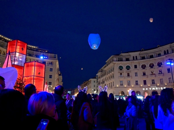 Εκατοντάδες φαναράκια υψώθηκαν μετά τις 6 το απόγευμα στον ουρανό της Θεσσαλονίκης, πάνω από τη στολισμένη πλατεία Αριστοτέλους.