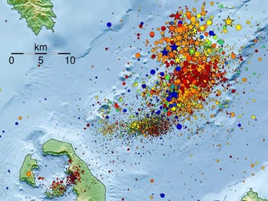 Χάρτης κατανομής σεισμών στην περιοχή των Κυκλάδων (Σαντορίνη-Αμοργός-Ίος). Η ακτίνα των κύκλων είναι ανάλογη του μεγέθους του σεισμού (επεξήγηση επάνω δεξιά), ενώ τα μεγέθη σεισμών μεγαλύτερα ή ίσα του 4.5 σημειώνονται με αστέρι. Ο χρωματισμός ανταποκρίνεται στο εστιακό βάθος, σύμφωνα με τη χρωματική κλίμακα (δεξιά).
