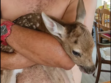 «Μέσα στις στάχτες και τη κόλαση της φωτιάς στη Ρόδο γεννήθηκε αυτή η ψυχούλα! Δυστυχώς η μητέρα δεν ζει...» γράφει και δημοσιεύει βίντεο που έχει το ελαφάκι αγκαλιά και του λέει «αγάπη μου ηρέμησε».