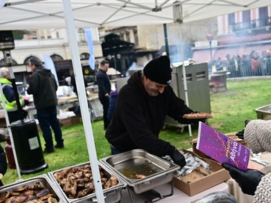 Μεγάλες ουρές σχηματίστηκαν για μια ακόμη χρονιά την Τσικνοπέμπτη στην πλατεία απέναντι από τη Βαρβάκειο Αγορά, από πολίτες που περίμεναν υπομονετικά για ένα κέρασμα με κρεατομεζέδες.