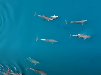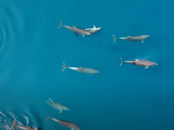 Το drone της ομάδας Up Stories κατέγραψε βίντεο με το κοπάδι των δελφινιών μέσα στα καταγάλανα νερά του Ευβοϊκού να κάνουν κόλπα, να παίζουν και να προσφέρουν σπάνιες εικόνες, σαν από μακρινές θάλασσες.