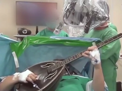 Η εγχείρηση για καρκίνο στον εγκέφαλο είναι μία από τις πιο αγχωτικές καταστάσεις που μπορεί να βιώσει κάποιος. Σίγουρα κανείς δεν θα φανταζόταν ότι μία τέτοια σοβαρή επέμβαση θα γινόταν συνοδεία μουσικής, πόσο μάλλον μπουζούκι.