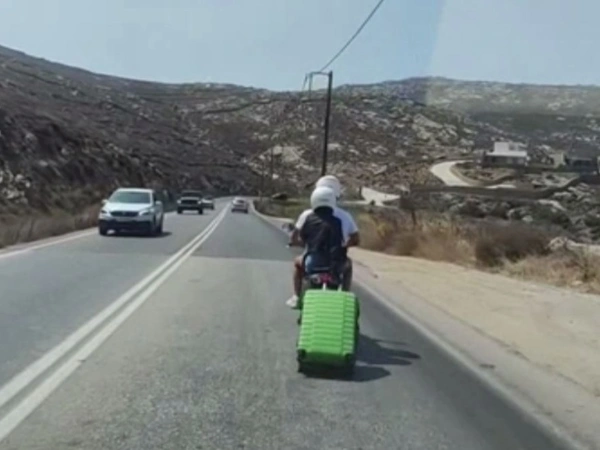 Τουρίστες οδηγούσαν σκούτερ σε δρόμο του νησιού με τον συνεπιβάτη να σέρνει μία βαλίτσα με ροδάκια στο πίσω μέρος.