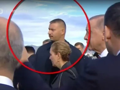 Ωστόσο τα βλέμματα συγκέντρωσε ένα σωματοφύλακας από την προσωπική φρουρά του Ταγίπ Ερντογάν. Όπως φαίνεται στα πλάνα που κατέγραψε ο ΣΚΑΪ ήταν ένας δίμετρος σωματοφύλακας που δεν άφησε λεπτό από τα μάτια του τον Τούρκο πρόεδρο από την στιγμή που αυτός αποβιβάστηκε στο «Ελευθέριος Βενιζέλος».