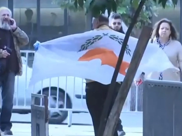 Όπως μετέδωσε ο ΣΚΑΪ, ένας πολίτης που έφερε την κυπριακή σημαία βρέθηκε έξω από το υπουργείο Εξωτερικών για να διαμαρτυρηθεί και απομακρύνθηκε από δυνάμεις της αστυνομίας.