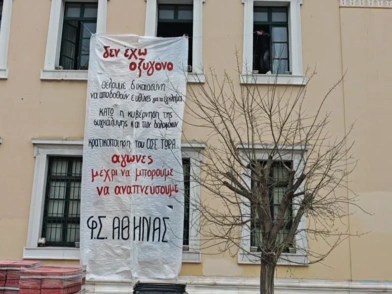 Πανό, με μήνυμα για τα Τέμπη και τη σύσταση των Ωνάσειων σχολείων, στην Πρυτανεία του ΕΚΠΑ κρέμασαν φοιτητές το πρωί της Παρασκευής.
