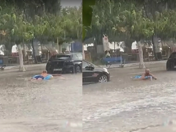Σε κλιπ που μοιράστηκε το Summer's Cool του ΣΚΑΙ, φαίνεται ο «μερακλής» άντρας να έχει βγει για μπανάκι σε δρόμο - ποτάμι, που πλημμύρισε μετά την έντονη κακοκαιρία των προηγούμενων ημερών.