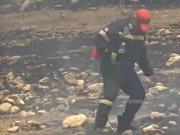 Κρατώντας ένα μπουκάλι με νερό και πατώντας πάνω στα σημεία που ακόμη σιγοκαίνε μικροεστίες φωτιάς, ένας πυροσβέστης προσπαθούσε να κάνει ό,τι μπορεί για να αποφευχθούν αναζωπυρώσεις, πατώντας με τα πόδια του «καντηλάκια».