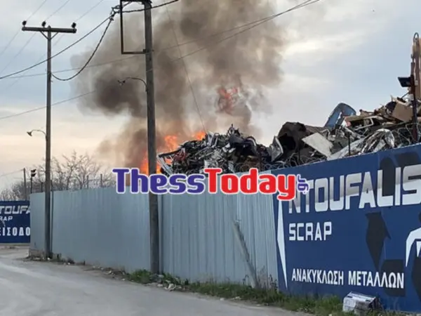 Μεγάλη φωτιά ξέσπασε σε μάντρα ανακύκλωσης μετάλλων στα Διαβατά στη Θεσσαλονίκη.