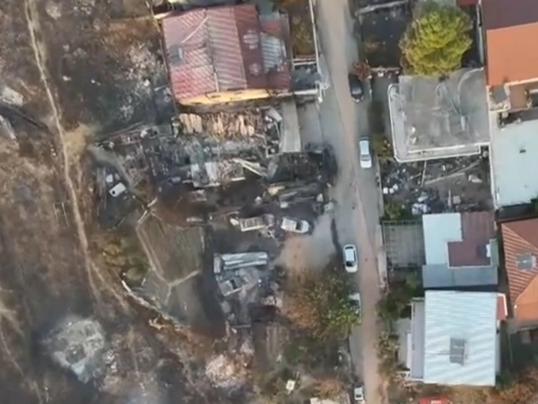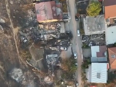 Εικόνες από ψηλά τραβηγμένες από drone του ΣΚΑΪ αποτυπώνουν το μέγεθος της καταστροφής. Στα πλάνα που παρουσίασε ο σταθμός, φαίνεται ο οικισμός της Αγίας Παρασκευής, με τη φωτιά να έχει «κατέβει» όλο το βουνό και να περνά μέσα από τον οικισμό.