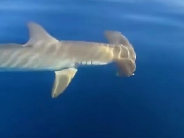 Ο μικρός καρχαρίας σφυροκέφαλος κολυμπούσε δίπλα στο σκάφος, δίνοντας την ευκαιρία στον ψαρά να καταγράψει το σπάνιο αυτό θέαμα. Το είδος αυτό είναι γνωστό ως «ζύγαινα» και θεωρείται ένα από τα πιο σπάνια είδη καρχαρία που εντοπίζονται στις ελληνικές θάλασσες.