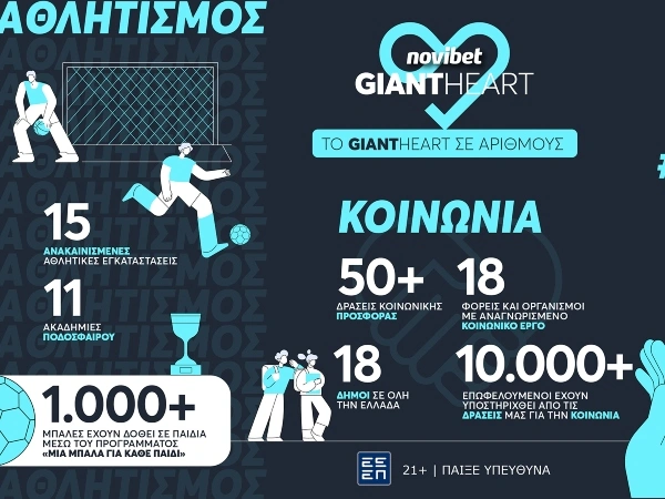 Από τον Μάιο του 2021, το Giant Heart, η πρωτοβουλία κοινωνικής προσφοράς της Novibet, διαγράφει μια αξιοσημείωτη πορεία γεμάτη δράσεις που ενσαρκώνουν την ουσία της κοινωνικής προσφοράς. Πιστό στις αξίες του, αναδεικνύει τη δύναμη της αλληλεγγύης και της αγάπης μέσα από δράσεις που επικεντρώνονται στον Αθλητισμό, την Κοινωνία και την Προστασία Αδέσποτων Ζώων.