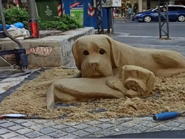Ένα πρωτότυπο γλυπτό από άμμο που απεικονίζει δύο σκυλάκια, έκανε ξαφνικά την εμφάνισή του σήμερα (2/11) στην οδό Τσιμισκή στη Θεσσαλονίκη, μαγνητίζοντας τα βλέμματα των περαστικών.