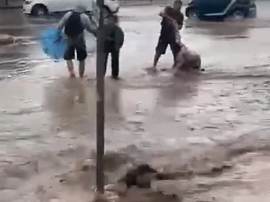 Άλλοι πολίτες κρατιούνται χέρι χέρι, προκειμένου να περάσουν τους δρόμους, οι οποίοι είναι αρκετά διαφορετικοί σε σχέση με το πρωί όπου τα καιρικά φαινόμενα ήταν εμφανώς καλύτερα.