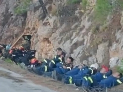 Συγκεκριμένα, ήρθε στο φως εικόνα η οποία δείχνει πυροσβέστες να κοιμούνται για λίγα λεπτά στην άκρη του δρόμου, φορώντας ακόμα τις στολές και τις μπότες τους, μετά από ώρες μάχης με τις φλόγες.