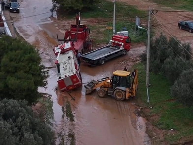 Τα εναέρια πλάνα από το drone του Orange Press Agency είναι αποκαλυπτικά και καταγράφουν μια περιοχή που κυριολεκτικά έχει βυθιστεί στη λάσπη και στα φερτά υλικά.