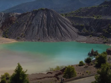 Στη μέση μίας μικρής, σχεδόν άγονης λεκάνης, μία ρηχή γαλάζια λίμνη είναι κρυμμένη, πλαισιωμένη από γυμνούς λόφους και πλαγιές.
