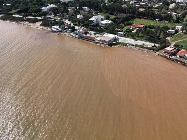 Οι ισχυρές βροχοπτώσεις που σημειώθηκαν τα ξημερώματα της Πέμπτης, 2 Απριλίου, μετέτρεψαν τη θάλασσα σε μια απέραντη καφέ έκταση, με αποτέλεσμα να θυμίζει λασπώδη λίμνη.