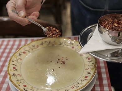 Αν και μπορούν να πολτοποιηθούν, τα λαχανικά κομμένα σε κύβους συνήθως αφήνονται ολόκληρα για να δώσουν στη σούπα την χαρακτηριστική πηχτή της συνοχή. Η σούπα σερβίρεται παραδοσιακά με χυμό λεμονιού και ψωμί στο πλάι».