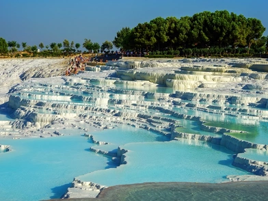 Από μακριά, το Pamukkale στην Τουρκία μοιάζει με χιονοδρομικό κέντρο, μια σειρά από υπέροχες λευκές πλαγιές και πλήθη τουριστών στην κορυφή, που φαινομενικά ετοιμάζονται να κατηφορίσουν προς την κοιλάδα με σκι και σνόουμπορντ.
