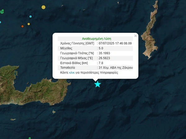 Το εστιακό βάθος του ισχυρού σεισμού στην Κρήτη εντοπίζεται στα 7,8 χιλιόμετρα, ενώ το επίκεντρό του βρίσκεται 31 χιλιόμετρα βορειοανατολικά της Ζάκρου, στα ανατολικά του νησιού.