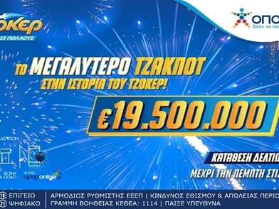 Το mega τζακ ποτ των 19,5 εκατ. ευρώ κυνηγούν οι παίκτες του ΤΖΟΚΕΡ σε όλη την Ελλάδα και σπεύδουν να συμπληρώσουν τα δελτία τους για να συμμετάσχουν στη μεγάλη κλήρωση, που θα πραγματοποιηθεί απόψε στις 22:00.