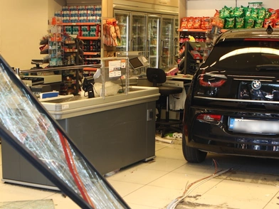 Μάλιστα, το αυτοκίνητο έφτασε δίπλα στα ταμεία του σούπερ μάρκετ και δίπλα επίσης στις προθήκες των λαχανικών.